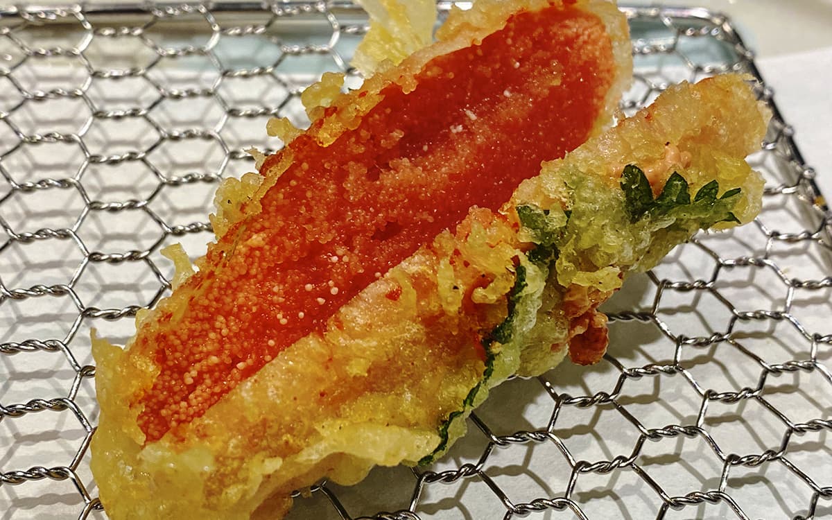 そのまま食べても美味しい明太子を大葉で巻いて揚げました。サックリ衣をまとった中はレアな明太子がたまらない。