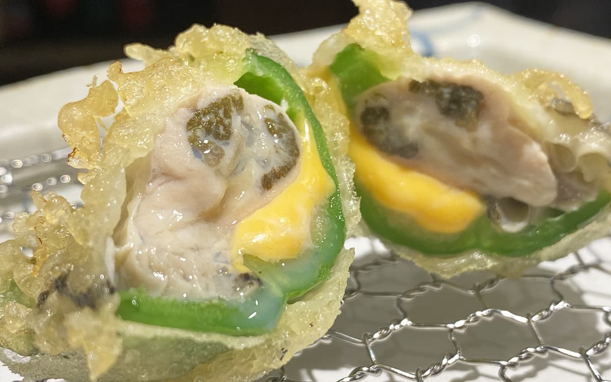ピーマンの肉詰めならぬ、ピーマンの牡蠣詰めにチェダーチーズも一緒に天ぷらにしました。ホクホク牡蠣とトロリなチーズが絶妙。