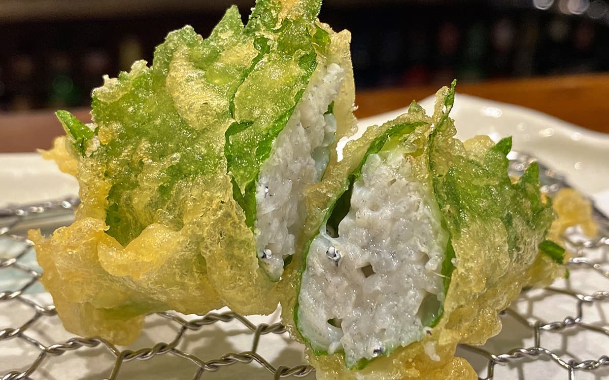 シラスを大葉でまとめて天ぷらにしました。シラスと大葉の絶妙なマッチに驚く、見た目にも色鮮やかな天ぷらです。