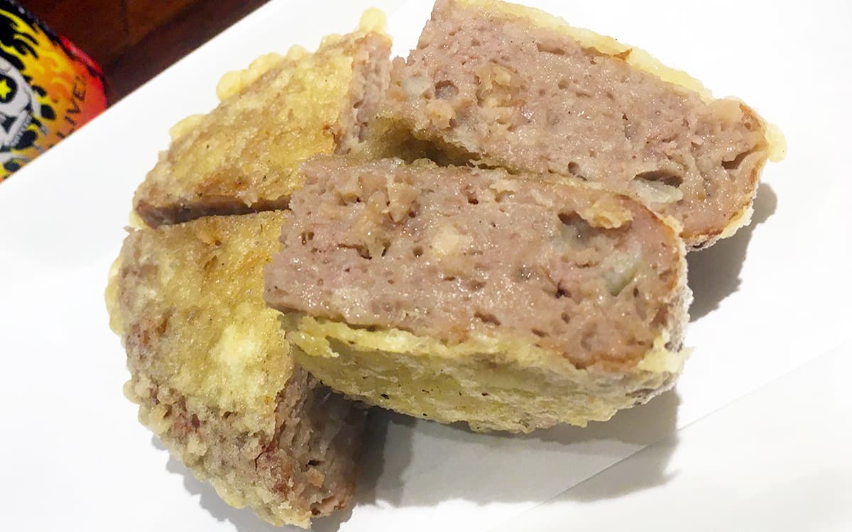 自家製ハンバーグの天ぷら。人気は無いけど、熱烈なファンもいます。ハバネロソースを少量かけていただくのが、美味しい食べ方。
