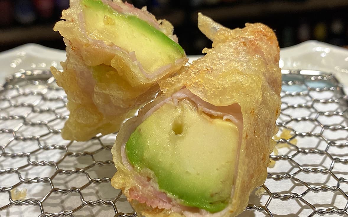 生ハムでアボカドを巻いた女性にも人気の天ぷらです。生ハムの塩気がアボカドにピッタリ!アボカド単品もあります。