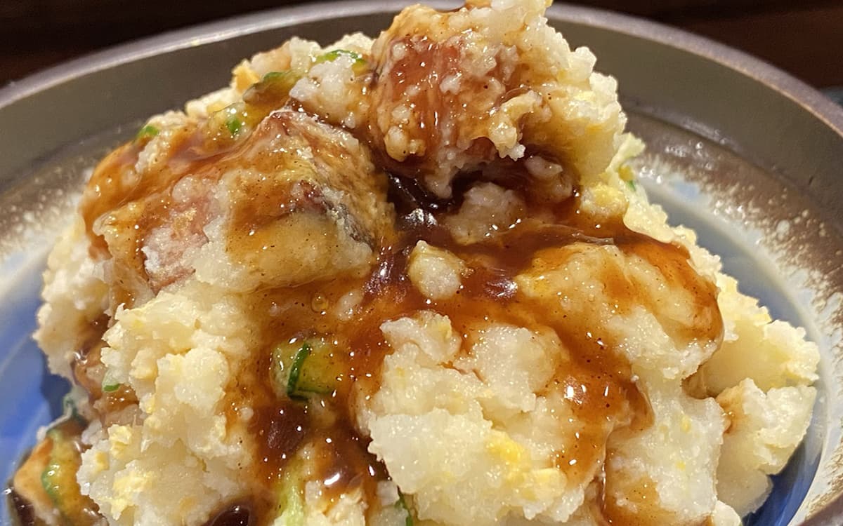 店内のメニューを見た時に、「えっ!この食材を天ぷらにするの?」って思うような食材が散見されます。もし、そう思ったら敬遠することなく一食は百見にしかず・・・まずは、食べてみてください。ただ、奇をてらっただけの料理ではありません。ここの大将は、年に何度も県外に出掛け話題のお店や一流店を食べ歩き熱心に勉強されています。その答えが、提供されるメニューに反映されています。だから、チープな感じは一切ありません。まずは、ポテトサラダと酢モツから始めてみてください。