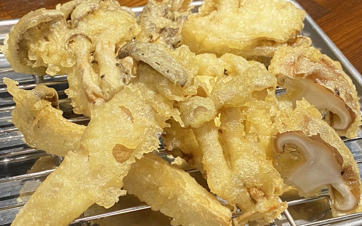 シメジ、マイタケ、肉厚シイタケ、エリンギ、ヒラタケなど香り高い数種類のキノコを盛り合わせた天ぷらです。