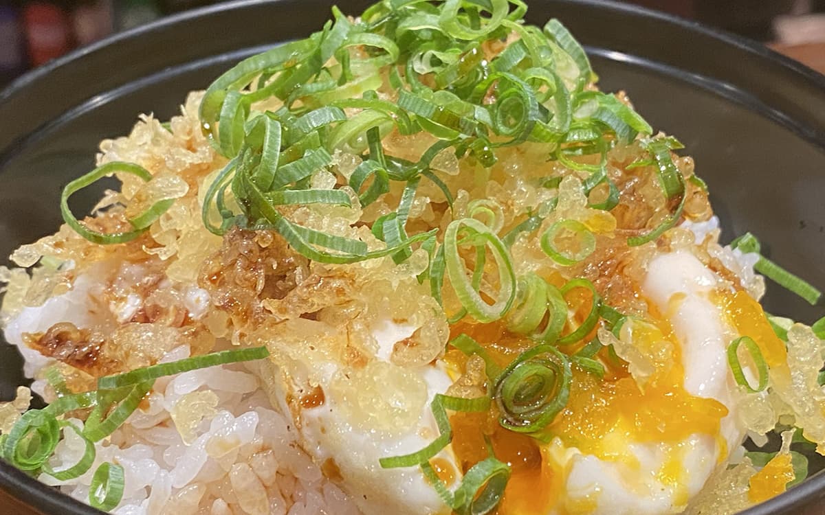テンプラ・タまごカけゴはん。略して、TTKG。半熟に揚げたネットリ玉子とサックリ歯触りの天かすとの出会いが絶妙な新感覚TKG。