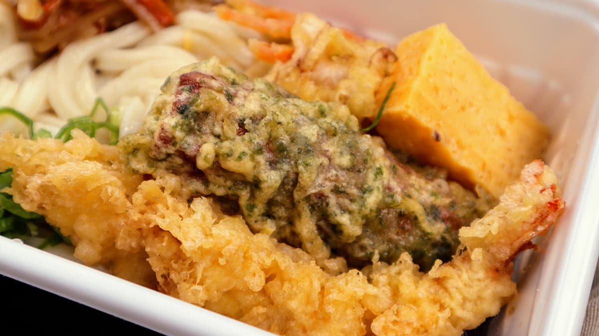 このお弁当のために、お持ち帰りに最適な讃岐うどんを選び抜きました。つゆも付いたぶっかけ式のうどん弁当になります。天ぷらも定番のエビ天、みんな大好きちくわ天の他に数種の天ぷらと玉子焼きもトッピング。女性人気も高いお弁当です。